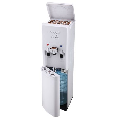 This water cooler is bottom loading with a cabinet to hold 3 or 5 gallon bottles.